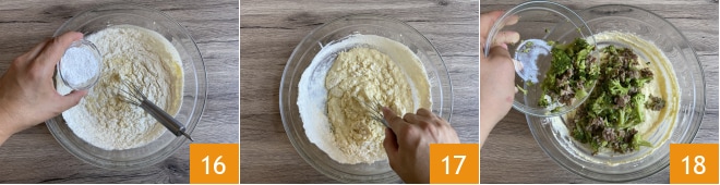 Finalmente incorpora también la levadura instantánea 16. Mezcla de nuevo 17. Añade a la masa ¾ de la salchicha y el brócoli 18.