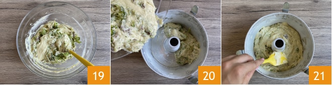 Incorpóralos delicadamente a la masa 19 y viértela en un molde de rosca de 18 cm engrasado y enharinado 20. Nivela la superficie con una espátula 21.