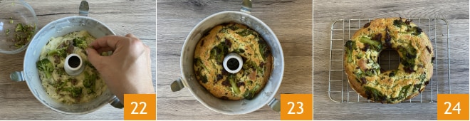 Añade encima el relleno restante 22, hornea a 180°, en horno estático precalentado, durante unos 35/40 minutos. Retira del horno 23 y transfiere a una rejilla para enfriar, luego sirve la rosca de brócoli y salchicha.