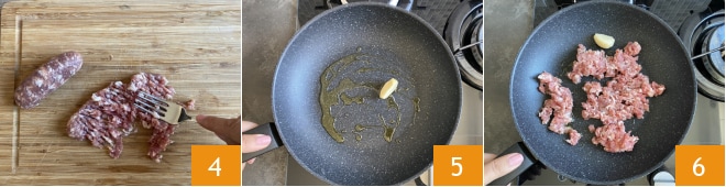 Elimina la tripa de las salchichas y aplástalas con un tenedor 4, luego pon en una sartén un chorro de aceite y un diente de ajo 5, añade la salchicha y cocina durante unos 3 minutos 6.