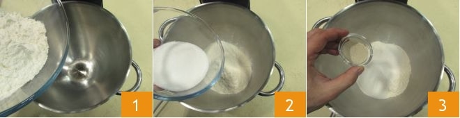 Preparad el bizcocho de frutas comenzando por verter la harina en el bol de una batidora 1, luego añadid el azúcar 2 y la levadura de cerveza deshidratada 3,