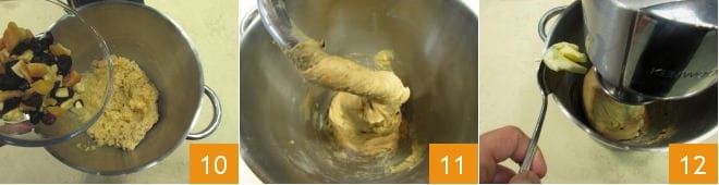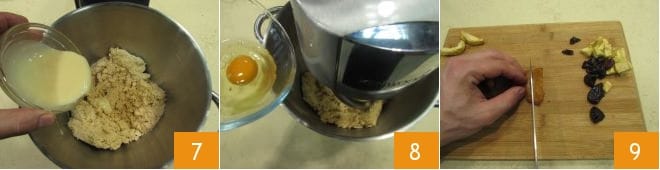 Cuando los huevos se hayan absorbido, detened la batidora, luego añadid la leche condensada 7, después siempre con el gancho mezclad y añadid el último de los 4 huevos 8. En una tabla de cortar picad en cubos gruesos la fruta deshidratada 9