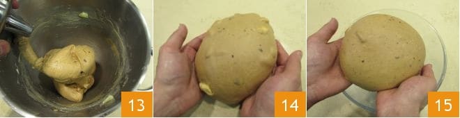 y continuad trabajando hasta obtener una masa lisa y bien incorporada 13. Sacad la masa de la batidora y trabajadla un poco en la encimera, el tiempo suficiente para darle una forma redonda 14. Colocadla en un recipiente ligeramente enmantecado 15 y dejadla levar durante 2-3 horas cubierta con film transparente en un horno apagado con luz encendida.
