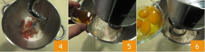 verted el zumo de naranja 4 y empezad a mezclar con el gancho, añadid luego el licor de hierbas 5 y el zumo de naranja. Comenzad a amasar durante unos segundos siempre con el gancho y luego verted 3 huevos, uno a la vez 6.