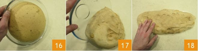 Pasado el tiempo necesario la masa habrá triplicado su volumen 16; volteadla sobre la encimera 17 y trabajadla con las yemas de los dedos hasta obtener un rectángulo de 15x30 cm 18.