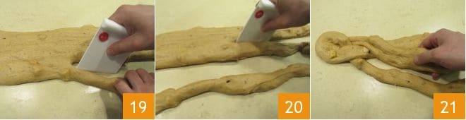 Luego con una rasqueta cortad la masa a lo largo 19, obteniendo así 3 tiras 20, luego unidlas por un extremo 21