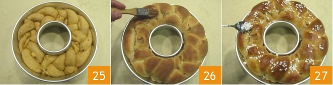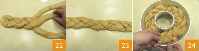 de manera que tendréis la parte por donde comenzar a trenzar alternativamente las tres tiras 22, hasta obtener una trenza 23. Colocad la masa en un molde para bizcocho de 25 cm de diámetro ligeramente enmantecado 24