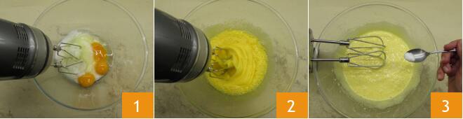 y el mascarpone 4. Batid nuevamente con las varillas eléctricas durante unos segundos. Añadid la harina tamizada 5 y la levadura 6.