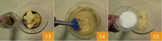 En otro bol pequeño, verted el café restante 13 y mezclad con una espátula para uniformar la mezcla 14. Verted la leche en la masa blanca 15.