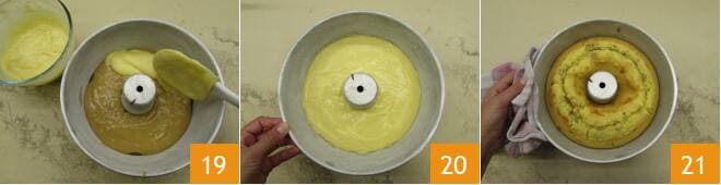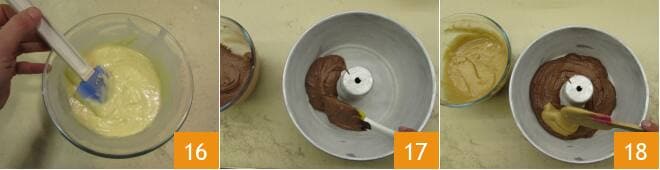 y mezclad también esta, debéis obtener una masa lisa y homogénea 16. Engrasad y enharinad un molde de rosca de 20 cm en la base y 22 cm en la superficie. Tomad la masa de cacao y vertedla en el fondo del molde 17. Extendela por toda la superficie y luego poned encima esta masa de café 18 siempre extendiéndola por toda la superficie.
