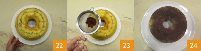 Desmoldad luego la rosca y trasladadla a un plato para servir 22. Espolvoread con cacao amargo 23 y servid vuestra rosca de tiramisú 24.