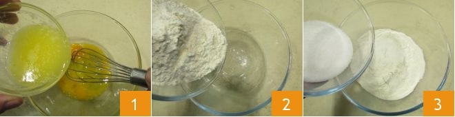 Para realizar la rosca de la Romaña, primero debes derretir la mantequilla al baño maría y dejarla enfriar; una vez fría, únele los huevos y bátelos ligeramente con la varilla para mezclar 1. En otro bol, vierte la harina tamizada 2, el azúcar 3,