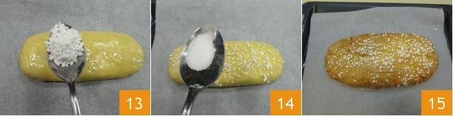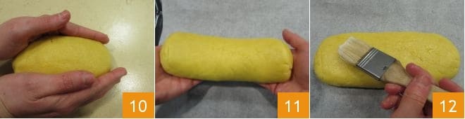 Una vez obtenido un bloque homogéneo y compacto, dale la forma de un panecillo 10, colócalo en una bandeja de horno 11 y aplástalo ligeramente con las palmas para que quede plano, luego pinta la superficie con leche 12.