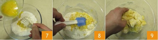 En este punto, vierte la mezcla de huevos y mantequilla derretida en el bol con los ingredientes secos 7 y mezcla con una espátula para recoger los ingredientes 8. Luego transfiere la mezcla a la superficie de trabajo y continúa amasando a mano 9.