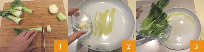 Para preparar los rollitos salados con corazón suave, comienza lavando los pak choi y eliminando la base del tallo 1. Sofríe el ajo en el aceite colocado en una sartén antiadherente 2, luego añade los pak choi 3