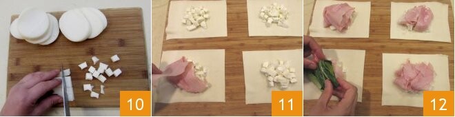Corta el queso provolone en rodajas de aproximadamente 1 cm de grosor, y de ellas saca tiras y finalmente dados 10. Ahora encárgate de la composición de los rollitos de jamón: comienza tomando una hoja de masa de hojaldre y córtala en 4 partes. Distribuye en el centro de cada cuadrado dado de queso scamorza y coloca también el jamón 11. Continúa con el pak choi 12,