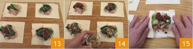 luego distribuye también los tomates secos 13 y los pistachos 14. Es el momento de cerrar los paquetitos: toma los dos bordes laterales y dóblalos hacia el interior, sobre el relleno 15.