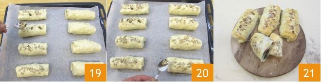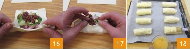 Luego toma el borde inferior de la masa y dóblalo también sobre el relleno 16 y continúa envolviéndolo 17, hasta obtener unos rollitos. Procede de la misma manera también con los rollitos vegetarianos: tendrás que rellenarlos con queso scamorza, pak choi, tomates secos y nueces. Finalmente, dispón los 8 rollitos obtenidos en una bandeja cubierta con papel de horno y úntalos con huevo ligeramente batido 18.