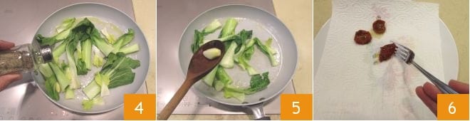 y déjalos marchitar durante unos minutos a fuego medio. Ajusta de sal y pimienta 4, luego retira el ajo 5 y reserva las verduras. Escurre los tomates secos sobre papel de cocina, para deshacerte del exceso de aceite 6,