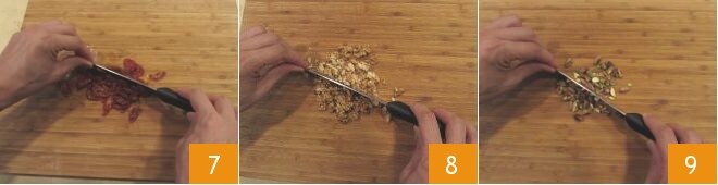luego pícalos groseramente 7. Haz lo mismo con las nueces 8 y los pistachos 9.