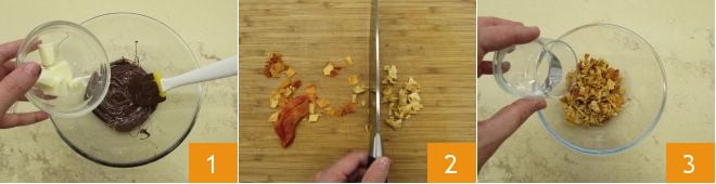 Para preparar el salami de chocolate con frutas exóticas, comenzad fundiendo el chocolate al baño maría o en el microondas, luego añadid la mantequilla y mezclad hasta que se derrita 1. Reservad y dejad templar mientras picáis el mango, la piña y la papaya deshidratados 2. Reunidlos en un bol y empapad con el ron 3.