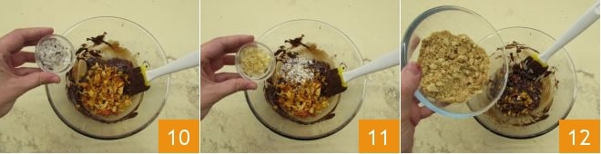 el coco 10, el jengibre 11 y finalmente las galletas desmenuzadas 12.