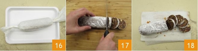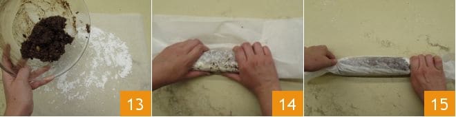 Mezclad bien hasta obtener una mezcla homogénea y transferidla sobre un papel de horno espolvoreado con azúcar glas 13. Moldead bien con las manos, ayudándoos siempre con el papel de horno para obtener un cilindro grande 14. Finalmente, envolved el salami como un caramelo en el papel de horno, enrollando y apretando los dos extremos 15.
