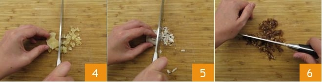 Mientras tanto, picad también el jengibre confitado 4, el coco deshidratado 5 y los dátiles deshuesados 6.