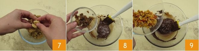 Finalmente, desmenuzad las galletas en un recipiente 7 y pasad a formar el salami de chocolate. En el recipiente con el chocolate fundido y mezclado con la mantequilla, añadid los dátiles 8, la mezcla de frutas secas que mientras tanto habrá absorbido el ron 9,