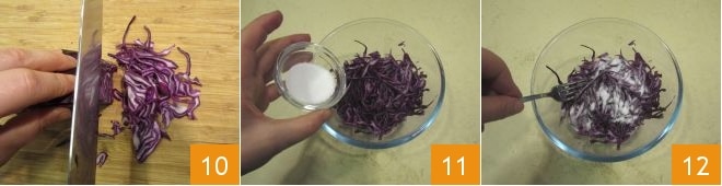 Mientras tanto, ocupémonos de la col roja: cortarla finamente 10, transferirla a un bol y añadir la sal 11. Mezclar con un tenedor 12, esperar 15-20 minutos,