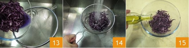 luego escurrirla del líquido que habrá soltado 13 y enjuagarla bajo agua corriente 14; este paso sirve para ablandar la col. Transferirla nuevamente a un bol y condimentar con pimienta y aceite 15. No será necesario añadir sal.