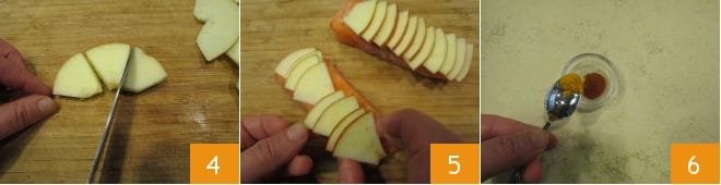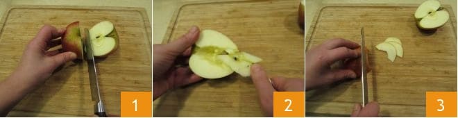 Para preparar el salmón con manzanas, comenzad por ocuparos de estas. Lavarlas, cortarlas por la mitad 1 y utilizando un cuchillo pequeño, quitar el corazón 2. En este punto, cortar las manzanas en rodajas no demasiado finas 3.