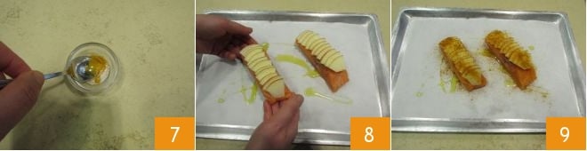 y dividir cada rodaja en tres triangulitos 4. Tomad vuestros filetes de salmón y colocad las manzanas encima 5. Tomad otro bol pequeño y añadid el pimentón y la cúrcuma en polvo (bastará con la punta de una cucharadita de cada una) 6.