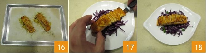 Sacar del horno los filetes ya cocidos y bien dorados 16; disponer una base de col roja en un plato de servir y colocar los filetes 17, decorar con hojas de menta y servir inmediatamente 18.