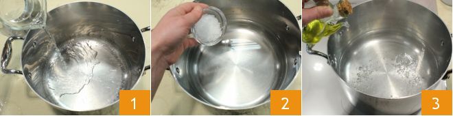 Para realizar los sándwiches de polenta con salmón y crescenza, comenzad con la polenta: para preparar la polenta, seguid nuestra receta de Polenta. Poned al fuego vivo una olla con agua 1 y llevadla a ebullición. Agregad entonces una cucharada rasa de sal gruesa 2, el aceite de oliva 3