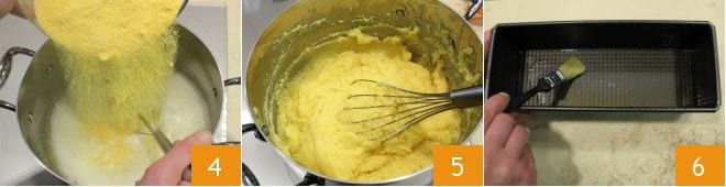 y verted en forma de lluvia la harina amarilla 4 mezclando continuamente con una cuchara de madera o un batidor 5. Continuad mezclando siempre en la misma dirección, combinando la capa más profunda con la más superficial hasta amalgamar la mezcla. Después de unos 40 minutos, empezará a despegarse de los bordes de la olla: continuad la cocción durante otros 20 minutos. Mientras tanto, untad con aceite un molde para plumcake que mida aproximadamente 26x10 cm 6,