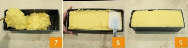 trasladad la polenta al molde 7, distribuid la mezcla uniformemente y nivelad la superficie con una espátula 8 o con el reverso de una cuchara. Dejad que la polenta se endurezca durante unas 2 horas a temperatura ambiente 9.