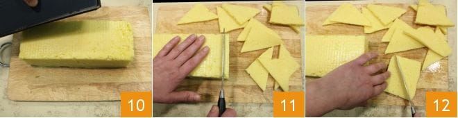 Transcurrido este tiempo, desmoldad la polenta sobre una tabla de cortar 10, cortadla en rodajas de aproximadamente 0.5 cm de grosor 11 y luego obtened triángulos dividiendo transversalmente cada rodaja: así obtendréis los sándwiches 12.