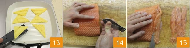 Pon una plancha al fuego y asad los sándwiches de polenta durante unos minutos, hasta dorar la superficie 13. Ahora ocupémonos del salmón: es fundamental que el salmón sea fresco y asegurarse con vuestro proveedor que ha sido "abatido", es decir, congelado a la temperatura correcta (mantenido entre -20 y -30 grados durante 24-48 horas). Limpiad el filete eliminando las espinas con unas pinzas de cocina 14 y luego cortad el salmón en tiras finas 15 y reservadlas.