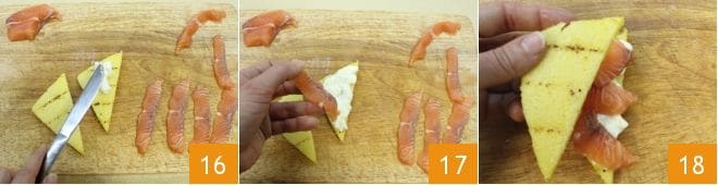 En este punto podéis rellenar los sándwiches: tomad una rodaja de sándwich y untad encima la crescenza fresca 16, colocad una tira de salmón 17 y cerrad con otra rodaja de sándwich 18. ¡Vuestros sándwiches de polenta con salmón y crescenza están listos para ser disfrutados!