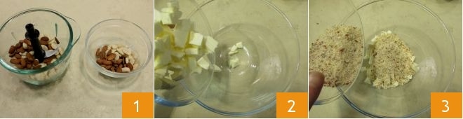 Para preparar la sbrisolona salada, coloca ambos tipos de almendras en un procesador 1 y tritúralas groseramente. En este punto, corta la mantequilla en cubos y transfiérela a un bol bastante grande 2. Agrega también las almendras 3,