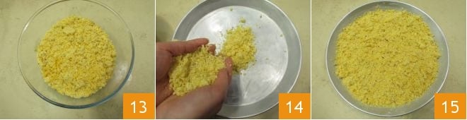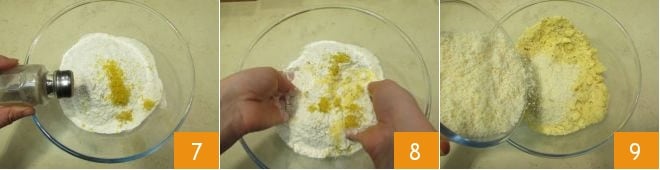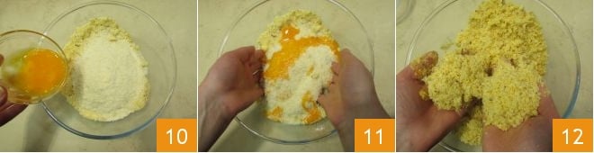y las yemas 10. Mezcla nuevamente siempre con las manos sin amasar 11 pero utilizando solo las yemas de los dedos para obtener una mezcla desmenuzable 12.