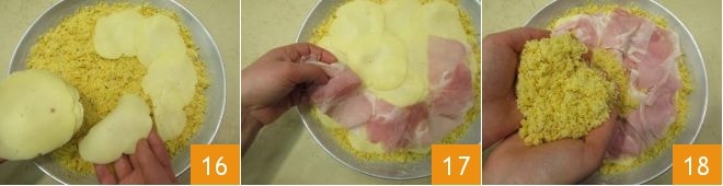 Corta la provola en rodajas y colócala sobre la mezcla 16, luego agrega también el jamón cocido en rodajas 17 y cubre con las migas de masa 18, esparciéndolas por toda la superficie.