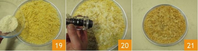 Termina con una pizca de parmesano 19 y un toque de pimienta negra 20. Hornea en horno estático precalentado a 180° y cocina la sbrisolona salada durante 50 minutos. Luego sácala del horno 21 y sírvela aún caliente.