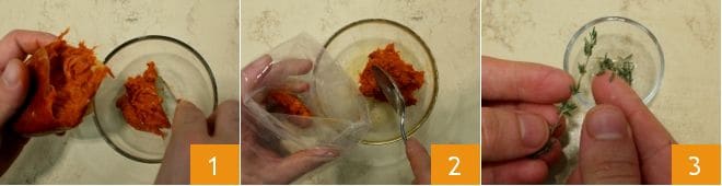 Para preparar las tortas con nduja y aceitunas negras horneadas, consigue el embutido nduja: recógelo en un cuenco 1 y luego viértelo en la manga pastelera ayudándote con una cucharita 2. Toma algunas ramitas de tomillo que serán necesarias y desprende las hojitas 3 que servirán para decorar las tortas. Finalmente, consigue las aceitunas negras secas al horno, que también puedes condimentar en un cuenco con pimienta rosa molida, orégano y un chorrito de aceite de oliva virgen extra para darles más sabor.