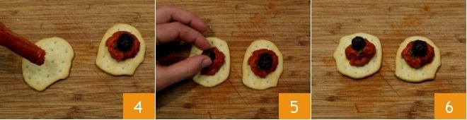 Ahora puedes montar tus tortas con nduja y aceitunas negras horneadas: en una tabla de cortar coloca las tortas, pon una nuez de nduja con la manga pastelera 4 y luego coloca en cada torta una aceituna negra horneada 6. Decora con una hojita de tomillo y tus tortas con nduja y aceitunas negras horneadas estarán listas para ser servidas como picante aperitivo.