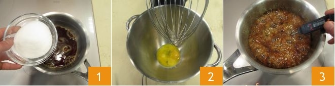 Para preparar el semifrío de café, lo primero que hay que hacer es verter el café en un cazo, añadir el azúcar 1, mezclar y llevar a ebullición, manteniendo la temperatura bajo control. Mientras tanto, coloca las yemas en el bol de una batidora de pie 2 y ponla a velocidad baja solo cuando el jarabe de café haya casi alcanzado los 121°C 3. Tan pronto como el jarabe esté a la temperatura adecuada (121°C) y las yemas estén espumosas