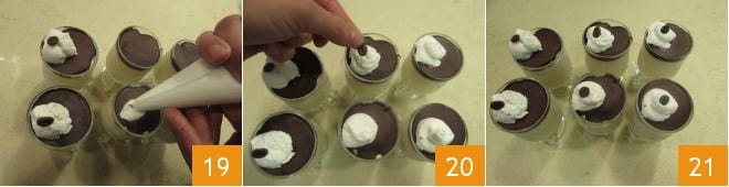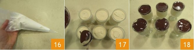 transfiérela a una manga pastelera y reserva por un momento 16. Derrite el chocolate negro al baño maría teniendo cuidado de que el agua del cazo no entre en contacto con el chocolate del cazo; una vez derretido, deja enfriar un poco y úsalo para decorar los vasos (17-18).