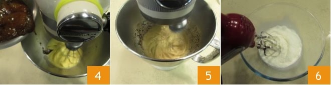 vierta el café en un hilo 4 y sigue batiendo aumentando la velocidad de la máquina hasta obtener una crema bien firme y hasta que la mezcla se haya enfriado 5. En este punto, monta la nata fresca 6, que no debe estar completamente montada sino solo semimontada.