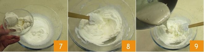 Luego añade el mascarpone 7 y mezcla con una espátula haciendo movimientos rotatorios de abajo hacia arriba 8 para no desmontarlo. Luego añade también la mezcla de café 9;